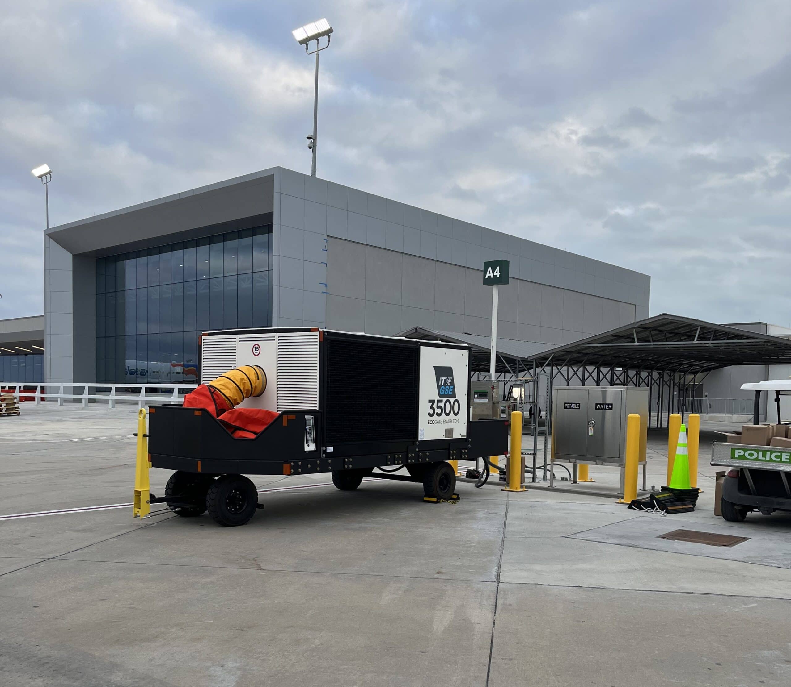 Trailer-mounted ITW GSE 3500 Mobile PCA parked near a terminal building at an airport, ready for aircraft cooling